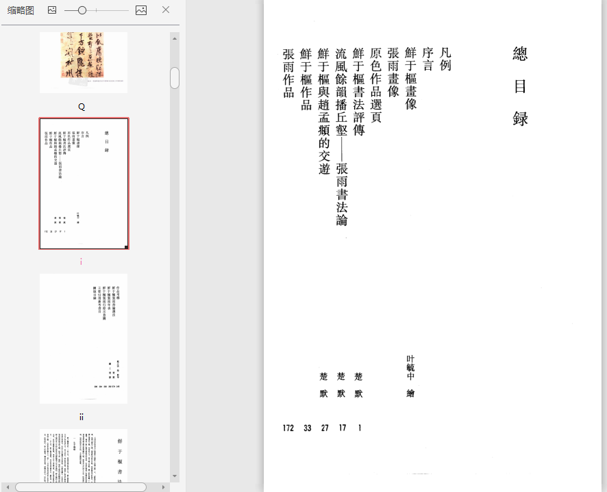 本书各卷目次除序言、总目录外,按两类立卷体例分列。断代卷为:原色器物或拓本图选页,概论和专论、作品图版、图版考释、年表、器物与作品出土分布示意图、主要引用参考书目和文献、图版目录。书家卷为:书家画像(甲类卷)、原色法帖或原色作品选页、书家评传和专论、断代书法概论(丙类卷)、作品图版、作品考释、书家书论选注、书家年表、书家行踪示意图、主要引用参考书目、图版目录。