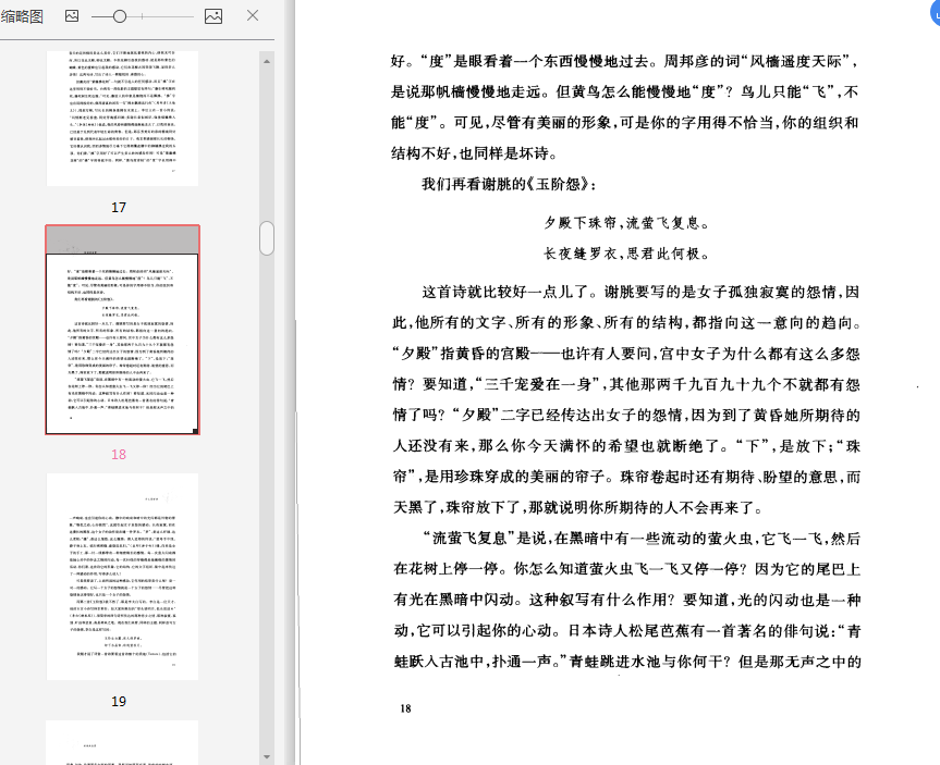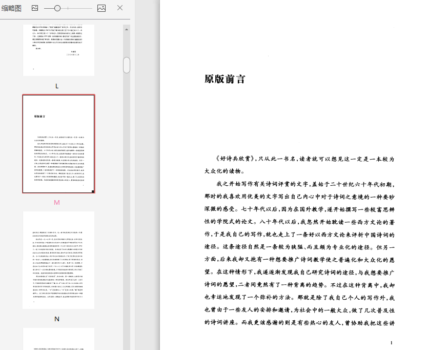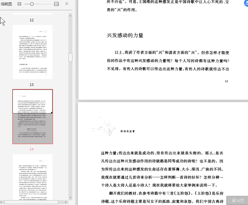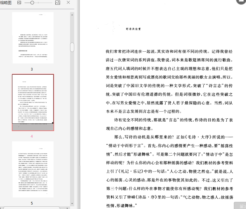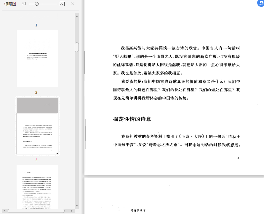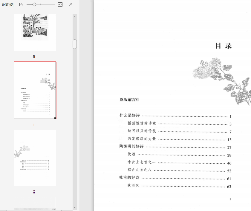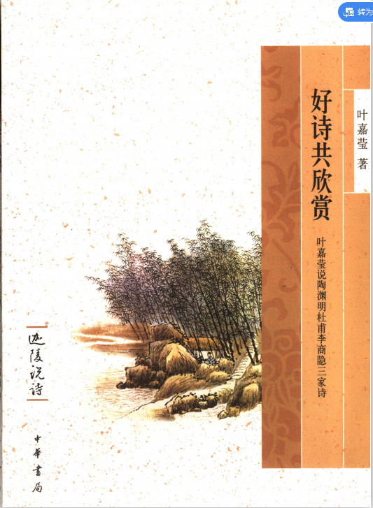 《好诗共欣赏》,只从此一书名,读者就可以想见这一定是一本较为大众化的读物。本书共分四讲,第一讲概论,主要是介绍中国旧诗传统重视兴发感动的美学特质,因为早在《毛诗·大序》中,中国的诗学就已经提出了“赋、比、兴”之说,关于此三义之说法,右边代学者虽有许多不同的意见,而私意以为此三义之所指者,实当为情与物相感发的一种作用关系。者,实当为情与物相感发的一种作用关系。“兴”是由物及心,“比”是由心及物,“赋”则是即物即心。这三种关系是对中国诗歌中的兴发感动之作用所做出的一种最为简单扼要的说法。此外在第一讲概论中,作者也曾将中国诗学中对于心与物之关系的看法,与西方诗论中对于心与物之关系的看法,做了一些基本的比较。至于以后三讲,则是以第一讲之概论为基础,对于陶渊明、杜甫和李商隐三家的一些诗例,所做的实践的评析。因此作者在评析中特别强调的,乃是这三位诗人在诗歌的写作过程中,对物象之选择与掌握,以及其心意之投注与运行的几种不同的方式;而作者更注重的则是在这三位诗人如何在他们不同的表述方式中,所传达的虽然性质不同,但却同样具有感动人心之效果的兴发感动的作用。