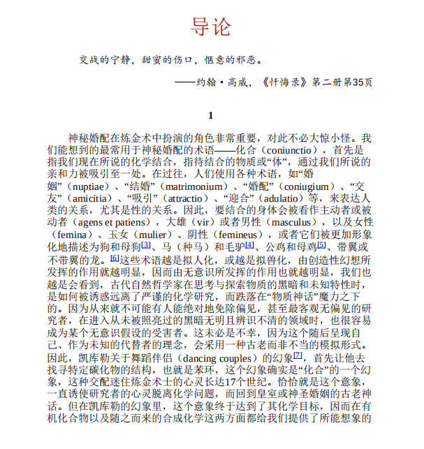 神秘婚配在炼金术中扮演的角色非常重要,对此不必大惊小怪。我们能想到的最常用于神秘婚配的术语—化合(coniunctio),首先是指我们现在所说的化学结合,指待结合的物质或“体”,通过我们所说的亲和力被吸引至一处。在过往,人们使用各种术语,如“婚姻”(nuptiae)、“结婚”(matrimonium)、“婚配”(coniugium)、“交友”(amicitia)、“吸引”(attractio)、“迎合”(adulatio)等,来表达人类的关系,尤其是性的关系。因此,要结合的身体会被看作主动者或被动者(agens et patiens),大雄(vir)或者男性(masculus),以及女性(femina)、玉女(mulier)、阴性(femineus),或者它们被更加形象化地描述为狗和母狗、马(种马)和毛驴、公鸡和母鸡、带翼或不带翼的龙。这些术语越是拟人化,或越是拟兽化,由创造性幻想所发挥的作用就越明显,因而由无意识所发挥的作用也就越明显,我们也越是会看到,古代自然哲学家在思考与探索物质的黑暗和未知特性时,是如何被诱惑远离了严谨的化学研究,而跌落在“物质神话”魔力之下的。因为从来就不可能有人能绝对地免除偏见,甚至最客观无偏见的研究者,在进入从未被照亮过的黑暗无明且辨识不清的领域时,也很容易成为某个无意识假设的受害者。这未必是不幸,因为这个随后呈现自己、作为未知的代替者的理念,会采用一种古老而非不当的模拟形式。因此,凯库勒关于舞蹈伴侣(dancing couples)的幻象,首先让他去找寻特定碳化物的结构,也就是苯环,这个幻象确实是“化合”的一个幻象,这种交配迷住炼金术士的心灵长达17个世纪。恰恰就是这个意象,一直诱使研究者的心灵脱离化学问题,而回到皇室或神圣婚姻的古老神话。但在凯库勒的幻象里,这个意象终于达到了其化学目标,因而在有机化合物以及随之而来的合成化学这两方面都给我们提供了所能想象的最大进步。回溯历史,我们可以说,当炼金术士制造这个谜中之谜(arcanum arcanorum),这个最高之神的圣礼(donum Dei et secretum altissimi),这个炼金术工作制高点的内在秘密时,他们嗅觉灵敏。随后对炼金的另一个核心理念(化学元素的相互转换性)的确认,在这个迟来的炼金术思维之凯旋中,也具有值得重视的地位。考虑到这两个关键理念显而易见的实践及理论重要性,我们有理由得出这样的结论:它们是直觉性预期,其迷人魅力可以在后来发展中得到证实。