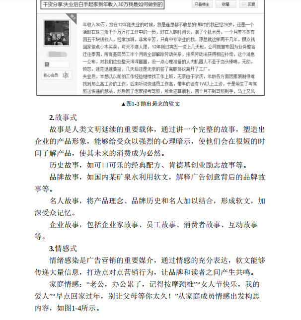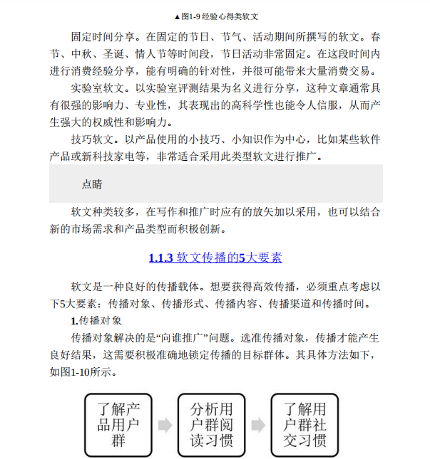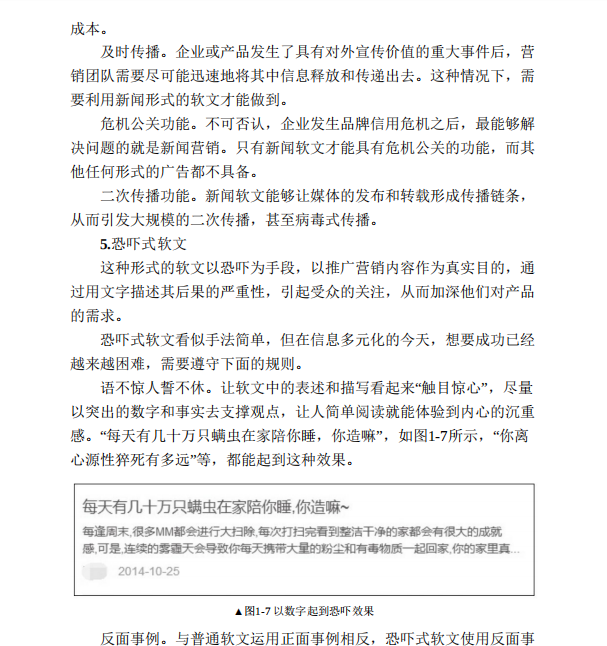 3.图表、流程图、示意图一应俱全,涉及面极广。书中图文并茂,实操方法有示意图相搭配,一看即懂,一学即会!不管是软文技巧还是营销策略,涉及的行业领域非常广泛,几乎每个行业都能找到实用方法!是不可多得的实用宝典!