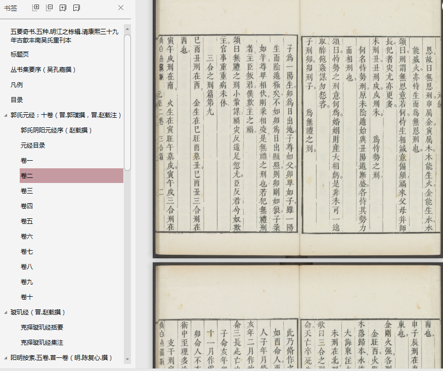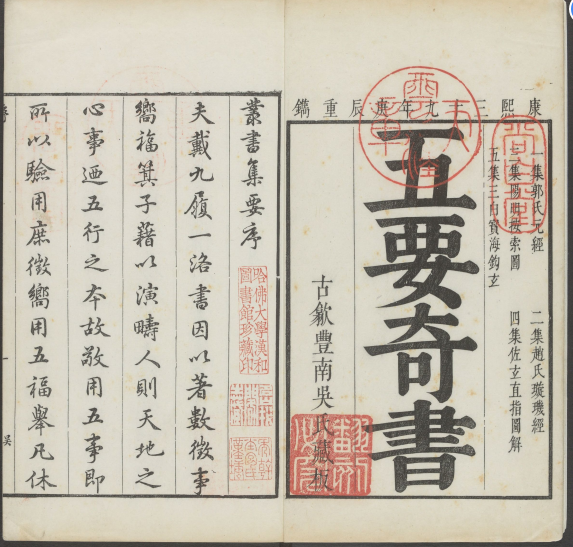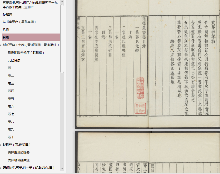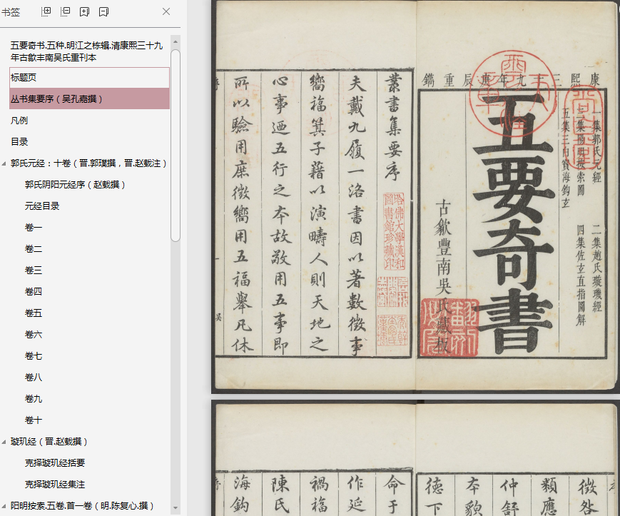 郭璞《郭氏元经》十卷、赵载《璇玑经》一卷、陈复心《阳明按索》五卷、刘伯温《佐玄直指》九卷、幕讲禅师《三白宝海》三卷,共五种。此为清康熙三十九年古歙丰南吴氏重刊本。