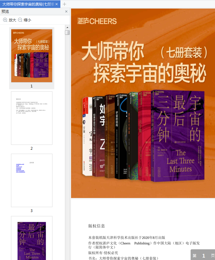 让你脑洞大开的宇宙学作品,让我们共同思索宇宙的起源与未来,重新认识人类在宇宙中的位置,开启一场动人心魄的史诗级宇宙穿越之旅,大师带你探索宇宙的奥秘(七册套装),包含了宇宙的最后三分钟,六个数,穿越平行宇宙,宇宙的结构,宇宙的起源,如果宇宙可以伸缩和宇宙,需要的自取。