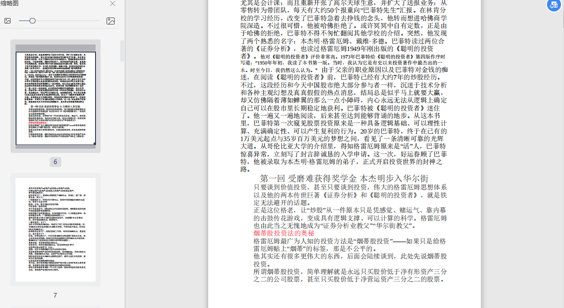 “70年后,他最成功的弟子沃伦·巴菲特大彻大悟,在1989年的致股东信里,又将痴迷捡烟蒂归为自己的‘错误’。同时向新图们布道与《投资者必读》近似的理论:’以合理价格买入好企业,要比用低廉的价格买入普通企业好得多。’”