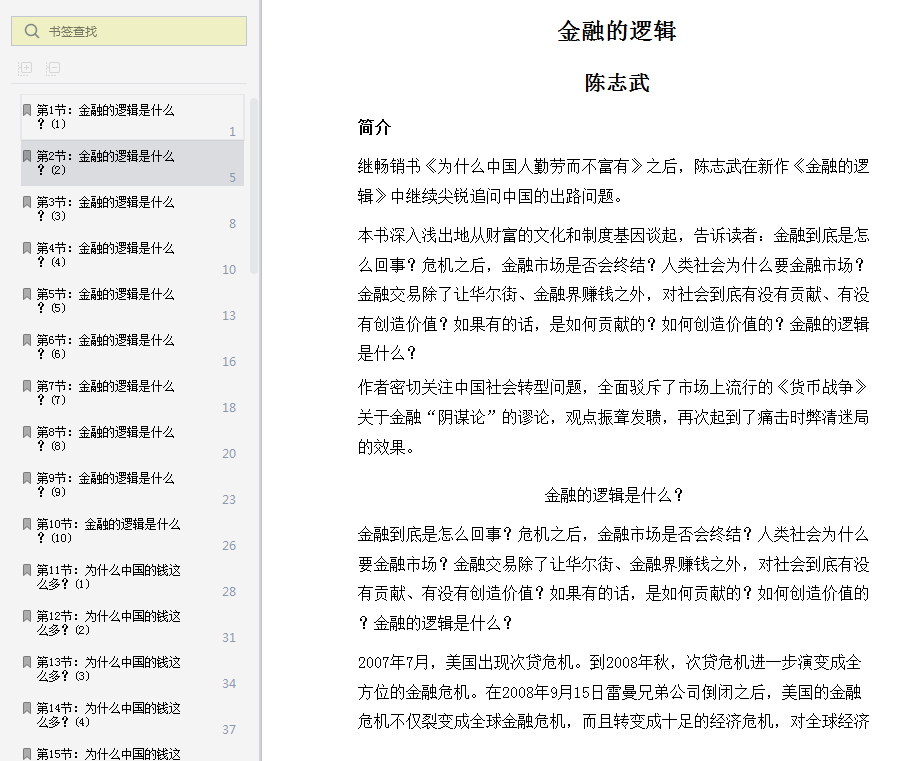 《金融的逻辑》探讨金融发展和一般市场发展对文化和社会带来的影响。作者从理论到事实对西方金融的发展正本清源,追溯财富基因,解读资本密码,剖析金融危机。作者创造性地从金融作为“大社会”中一分子的角度研究金融,对儒家文化进行金融学反思,直言市场经济是个人解放的必由之路,发展金融是中国的唯一出路。作者长期关注社会转型问题,痛击时弊,观点振聋发聩。“政府有钱不如民间富有”、“西方的兴起主要靠制度而不是掠夺”、“消费驱动型模式不会改变” 等观点启发了更多人思考转型中的中国社会、经济和文化。