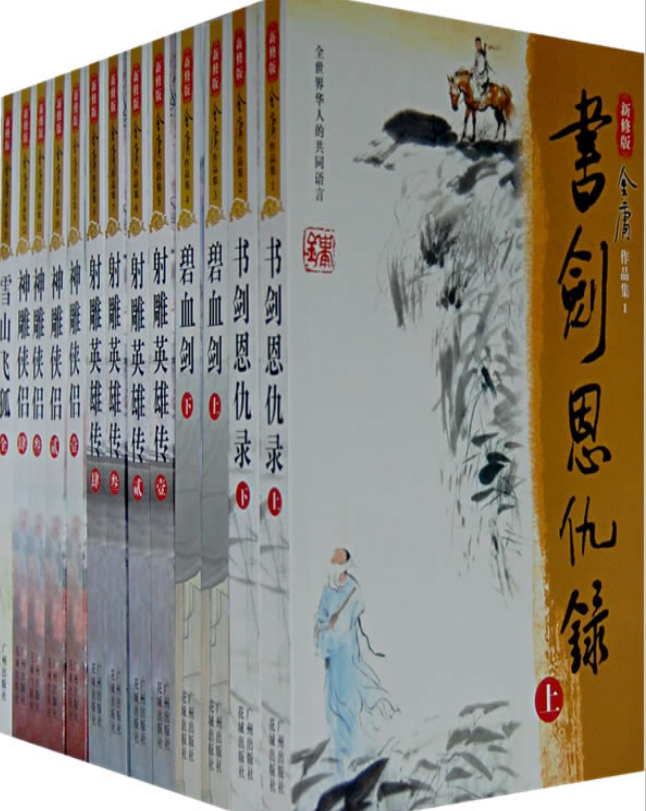 经典旧版,版本流通久、销量大、金迷熟悉的版本,其中《白马啸西风》、《鸳鸯刀》收录于《雪山飞狐》中,《越女剑》、《卅三剑客图》收录于《侠客行》。