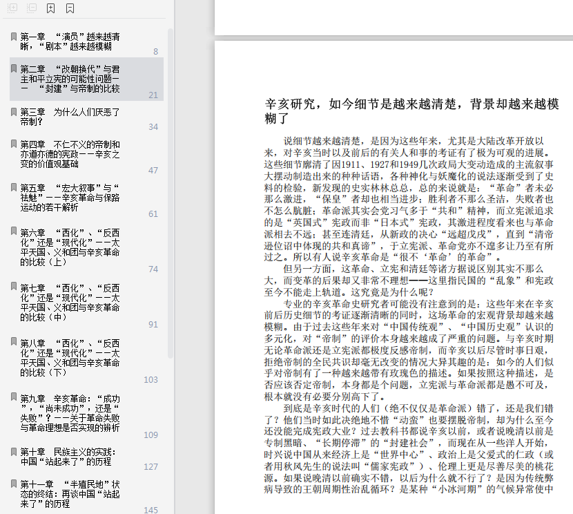 此书的重点在否定“帝制”,即“秦制”上。从晚清到民国,从维新派到立宪派到革命派,从谭嗣同到孙中山,前后数十年,众多中华仁人志士抛头颅、洒热血意图带领民族走出“秦制”,实现民富国强的现代化的理想。晚清到民国的历史也即是这些仁人志士奋斗的历史。书中对这段时期的重大历史事件产生的背景和发展脉络作了很好地疏理、剖析,条缕清楚,不乏灼见。