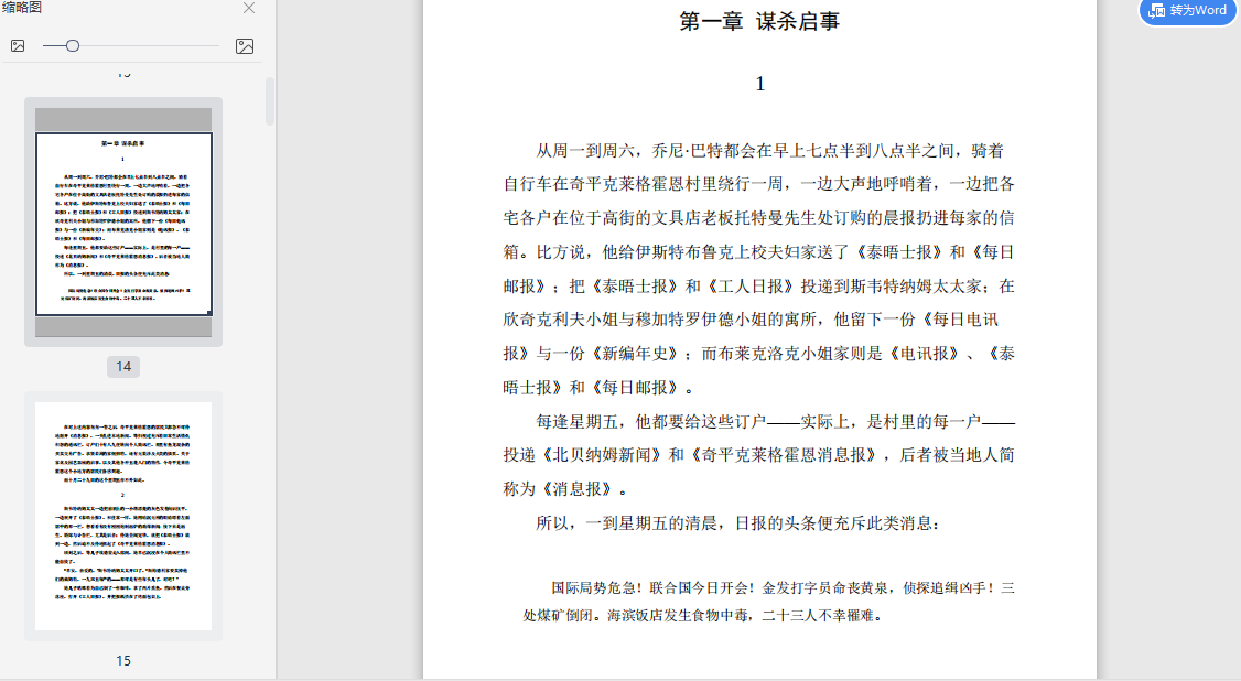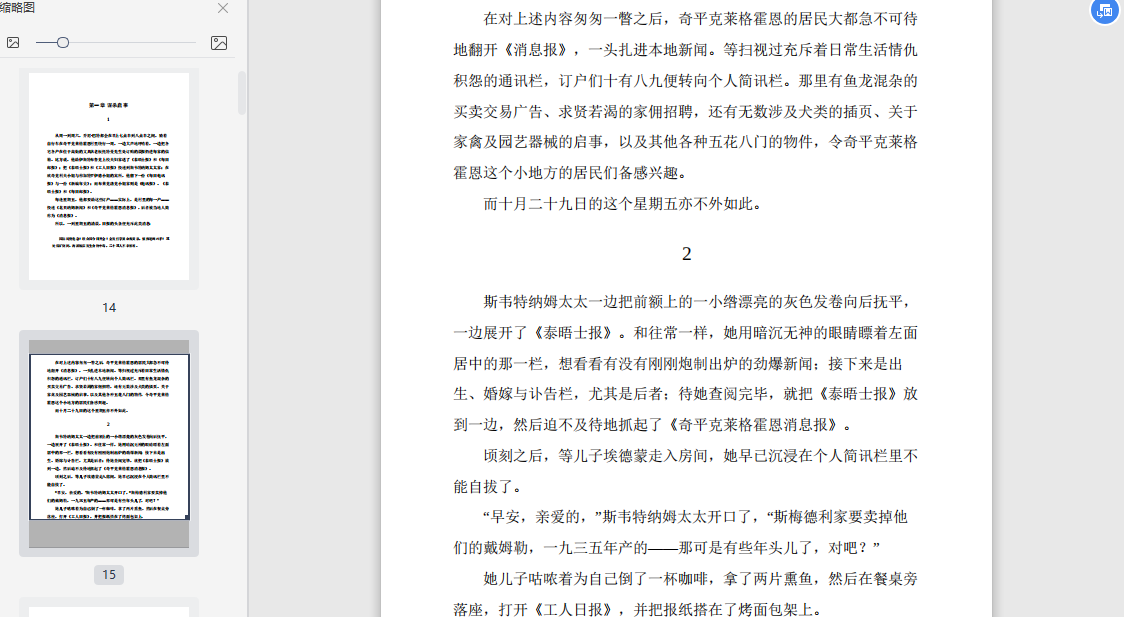 斯韦特纳姆太太一边把前额上的一小绺漂亮的灰色发卷向后抚平,一边展开了《泰晤士报》。和往常一样,她用暗沉无神的眼睛瞟着左面居中的那一栏,想看看有没有刚刚炮制出炉的劲爆新闻;接下来是出生、婚嫁与讣告栏,尤其是后者;待她查阅完毕,就把《泰晤士报》放到一边,然后迫不及待地抓起了《奇平克莱格霍恩消息报》。
