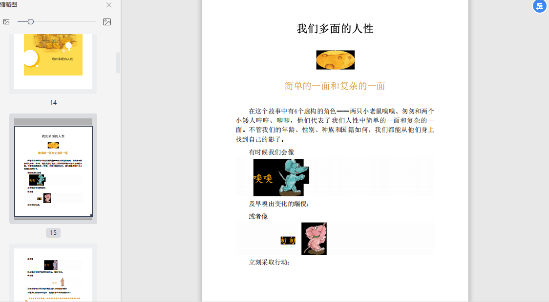 那么变化都是量变到质变的过程。随时去发现奶酪有没有不新鲜了,有没有发霉。奶酪不是突然就没有的,而是一天一天减少的过程,嗅嗅和匆匆及时发现了,并且马上踏上了寻找新的奶酪的过程,而哼哼唧唧只是每天理所当然地享受有充足的奶酪,没有考虑过这些奶酪哪里来的,有一天会不会消失。