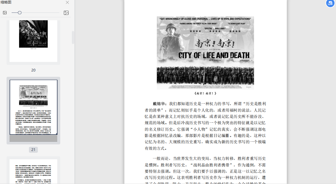 戴锦华:我同意王炎的描述——心理历史叙述,相当准确。与此并列的是苏联史诗片——《伊万雷帝》,或《列宁在十月》,或《解放》o我管后者叫历史唯物主义全息图的片段。就是说,历史唯物主义的史观是叙事基础,这一历史逻辑的前提,潜在地要求观众拥有一幅关于历史的全息图,参照着这幅整体图景,影片表现历史中的某些片段和场景。电影给出的场景与观众心中的历史全息图融合,并由后者补足,便可以有效地整合出感人的历史故事与画面。