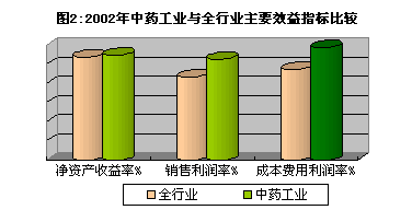 中药工业是我国医药工业中始终保持较好盈利水平的一个领域。2002年中药工业的主要效益指标好于医药工业的平均水平,其中:净资产收益率、销售利润率、成本费用利润率分别达到10.93%、10.55%、11.74%,均高于或明显高于医药工业(分别为10.76%、8.63%、9.44%)的平均水平。显示了我国中药工业“含金量”较高、盈利水平较好、绩效好于医药工业整体平均水平的产业特征。(图2)