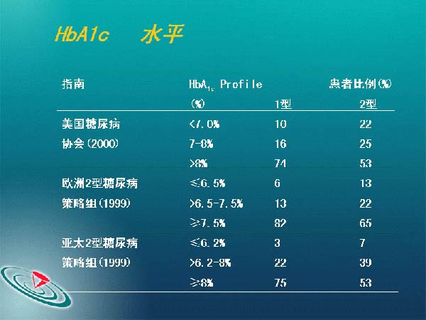 以糖化血红蛋白作为血糖控制好坏的一个水平,目前都倾向于用糖化血红蛋白作为控制好坏的一个指标,控制比较好的,糖化血红蛋白应小于7.0%,7.0%以上表示这个病人控制就不好。这个资料显示在美国、欧洲和亚太地区,糖化血红蛋白这个标准控制比较差的比例占得更多,全都是这样的。也就是说整个这个糖尿病的这个病人涉及到每个病人长期的控制血糖都控制得不好。见下图所示。