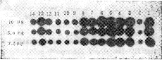 3、RNA打点杂交:在RNA样品中加入等体积的变性液(34%乙二醛,25mmol/L磷酸氢二钠,pH6.5),50℃水浴1小时。变性后的RNA经倍比稀释三个梯度后点在20×SSC预处理的硝酸纤维膜上,置80℃干燥2小时,在20mmol/L三羟甲基氨基甲烷*盐酸(pH8.0)溶液中煮沸10分钟,室温下晾干备用。杂交按Hames等[10]方法进行。杂交完毕后将膜取出进行漂洗,晾干后在暗室中压X线片,加双侧高能增感屏,-20℃曝光1周显影。