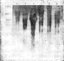 1、质粒DNA的提取与探针的制备:c-myc质粒系美国麻省理工学院Jay Mavgerstern教授惠赠。质粒的提取采用碱变性法[4]或羟基磷灰石法[5]。将提取的质粒DNA用EcoRI和Hind III酶解后,用低融点琼脂糖法[6]回收约8kb的c-myc基因片段。利用缺口平移法[7]制备同位素标记的c-myc探针(32p-dATP 为北京福瑞公司产品),探针的比放射性约为1×108cpm/μg。