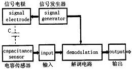 系统构成 我们开发了基于电容传感器的呼吸波检测装置。该检测装置主要由5部分组成:精密正弦信号发生器、电容传感器、预处理电路、解调电路和输出级。图1所示为系统框图。精密正弦信号发生器产生正弦电压源送到人体,电容传感器检测电流(电容)的变化,将调幅波送到预处理电路,然后经解调和输出级,即得到呼吸波信号,可送入记录仪或计算机的A/D输入级,以便显示、记录和分析等。