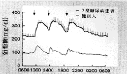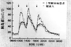 二、Ⅱ型糖尿病患者餐后异常的胰岛素分泌:Ⅱ型糖尿病患者餐后胰岛素释放延迟,其峰值后移且降低,(而两餐间胰岛素水平又不能恢复到基础水平,易出现低血糖反应,)这种异常的胰岛素分泌模式导致餐后血糖的持续性升高,最终引起全天血糖水平失控(见图)。此外,Ⅱ型糖尿病患者在餐时与餐后所分泌的胰岛素质量也有所改变,其中主要表现为胰岛素原和其裂解产物成份有所增加。