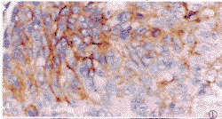 1.3.2 原位杂交(TSH流程gene point法) (1)杂交前准备:新鲜冷冻保存的组织,恒冷箱冷冻切片(5 μm厚):4%多聚甲醛固定:100%、95%、85%乙醇脱水2 min;PBS洗;蛋白酶K 1 μg.L-1(37℃)20 min;0.1 mol.L-1甘氨酸、PBS洗2×3 min(终止消化);PBS洗2×5 min;4%多聚甲醛固定5 min;PBS洗后系列乙醇脱水;0.25%乙酰酐约0.1 mol.L-1、三乙醇胺液(pH8.0)10 min、PBS洗2×5 min。(2)杂交:杂交液中内含cRNA-b探针2 μg.L-1(48℃ 2×5 min)杂交8 h;每片10~20 μl杂交液;以PBS代替杂交液作阴性对照;用覆盖膜防止液体蒸发,湿盒内加少量的甲酰胺。(3)杂交后洗脱:50%甲酰胺洗5 min(45℃);2×SSC洗2×5 min(45℃);1×SSC洗2×5 min;0.5×SSC洗2×5 min;0.05 mol.L-1(pH8.0)TBS洗5 min;3%H2O2抑制内源性过氧化物酶30 min(室温);PBS洗3×3 min。(4)信号放大检测:Streptavidin-HRP 1∶500(37℃ 20 min);PBS洗3×3 min;生物素化酪胺分子1∶500(37℃ 20 min);PBS洗3××3 min;Streptavidin-HRP 1∶1 000(37℃ 30 min);PBS洗3×5 min;0.05%DAB(3',3-二氨基联苯胺盐酸盐)+0.03%H2O2显色8~12 min;水洗后苏木精衬染;常规树脂封片。10例新鲜标本用原位杂交检测。