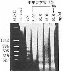 中华灵芝宝在5mg/ml浓度下,作用24小时,琼脂糖电泳就显示典型的180~200bp左右的凋亡梯度状条带,随着作用剂量的增大,梯度状条带更明显;另外中华灵芝宝10mg/ml浓度作用8小时,清晰的梯度状条带就出现(图4),以上实验表明中华灵芝宝能诱导人红白血病K562细胞凋亡。