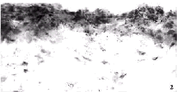 图1 正常角膜上皮细胞层有PDGF mRNA表达,基质中无表达(×400) 图2 PRK后2月,上皮细胞层PDGF mRNA呈浓密表达,且基质中亦有轻微表达(×400) Fig.1 PDGF mRNA expression was