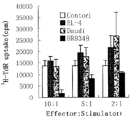 Fig 4MMC-treated tumor cells induced γδTILs to proliferate The ratios of stimulator cells including Daudi,HR8348 and EL-4 tumor cells to effector cells were 10∶1,5∶1 and 2∶1,respectively.Data are expressed as cpm