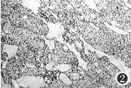 图2 瘤组织内有许多毛细血管腔隙,血管间为实性泡沫或空泡样细胞(HE×100)。
