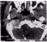 , http://www.100md.com     非颈动脉球体源的血管球瘤约有1%的肿瘤具有分泌儿茶酚胺的活性[7],当血中儿茶酚胺高于健康人4~5倍或检查触压肿块即出现如头痛、多汗、心悸、苍白、恶心、血压不稳等症状的患者,应进行24 h尿中3-甲氧基肾上腺素、香草扁桃酸及血浆内去甲肾上腺素、多巴胺、3-甲氧基肾上腺素的检测。对有儿茶酚胺分泌活性的颈静脉球瘤患者,应于术前2周给予苯氧苯拉明(α阻断剂)10 mg ,2次/d,普萘洛尔(β阻断剂)10 mg ,3次/d ,2周。本组11例中无1例示有儿茶酚胺分泌活性者。