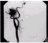 4例乳突X线摄片,1例示颞骨鼓部骨质破坏,1例未见明显骨质破坏,2例示乳突及外耳道后骨壁骨质破坏。5例行CT检查:1例鼓室明显扩大,鼓室前壁及颈静脉球窝前壁骨质破坏。岩锥骨质破坏4例,其中2例为岩锥内占位性病变分别为3 cm×2 cm×2 cm及3 cm×3 cm×2cm软组织影,并破坏岩锥前壁突入中颅窝;颈内静脉球受压移位或消失各1例,其中移位的1例同时行磁共振成像(magnetic rasonance imaging,MRI)、磁共振血管成像(magnetic rasonance artery,MRA),MRI示右侧颈内静脉球窝处见一类圆形肿块,边界清,约3 cm×2 cm×2 cm,MRA示右颈内静脉球区有异常血管团,右颈内动脉近颅段轻度向左移位,动脉造影示35 mm×32 mm团块影,供血丰富,主要由颈外动脉的颞浅及颌内动脉支供血(图1)。