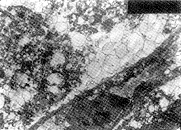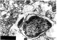 神经细胞破坏,核浓缩,胞浆内容物丢失。TEM,8300
