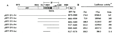 A.Schematic diagram of BFV IP and the amplificated genome regions by PCR;luc.firefly luciferase gene(upper).Lines represent BFV IP regions remained after deletion.B.“-Tas”means cotransfection of the reporter plasmid and pUC19.This value represents basal promoter activity.“+Tas”means cotransfection of the reporter plasmid and the transactivator plasmid (pBFVORF-1).a.Each experiment was done at least 3 times in triplicate and each plate was transfected with 0.2μg of deleted luciferase expression plasmid, 0.75μg of pBFVORF-1,0.6μg of pCMV β-gal and 3 μg of Lipofect AMINE(GIBCO/BRL).The cells were harvested to determine Luc activity at 48h after transfection.Luciferase activities were normalized for β-galactosidase.Generally,less than 15% variation in replicate samples was observed.