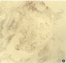 图2 中度肾小管间质病变MsPGN肾小管间质区IL-13mRNA大量表达,图1,2均为ISH×400