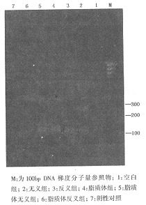 4. c-myc mRNA表达的抑制:RT-PCR检测c-myc mRNA水平显示脂质体反义核酸组较各对照组c-myc 基因的PCR扩增条带明显减弱,见图1。