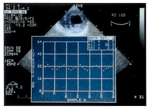操作与图像获取 检测时,在探头前方预先固定一特制的小水囊,垂直置于左室前壁,探头中心频率固定为3.0MHz,调节增益至日常操作最佳图像,然后固定设置,保证每次实验过程中仪器均保持同样的设置,以排出仪器发射和接收条件不同对测值的影响。分别获取冠状动脉左前降支阻断前、阻断20分钟及再灌注10、30、60、90分钟时刻的左室乳头肌短轴二维、M型和散射二维图像,并存入光盘,待分析测量。