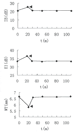 横坐标为时间(分),纵坐标分别为IB、EI和WT(mm),箭头所指处为再灌注时刻。