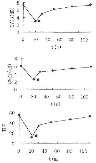 横坐标为时间(分),纵坐标分别为CVIB、CVEI和TH%,图中箭头所指处为再灌注时刻。