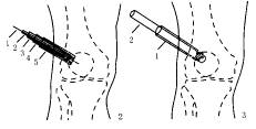 1.2 材料 导针1根,金属扩张套管1副,带有数个侧孔的硅胶管2根。见图1。导针为Ø1 mm克氏针。金属扩张套管为数个直径与长度不同的不锈钢导管组成。管的外壁标有cm单位刻度。进入关节端管壁磨成稍薄,以减少进入的阻力。扩张套管内径由1 mm递增,每一外套管内径均与相邻内套管外径一致。内径与硅胶管外径一致的套管我们称为工作套管。每一外套管均比相邻内套管短2 cm。