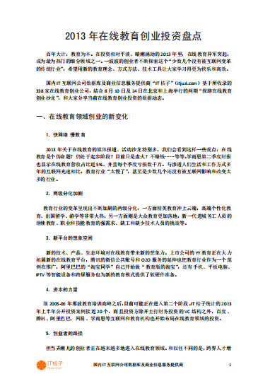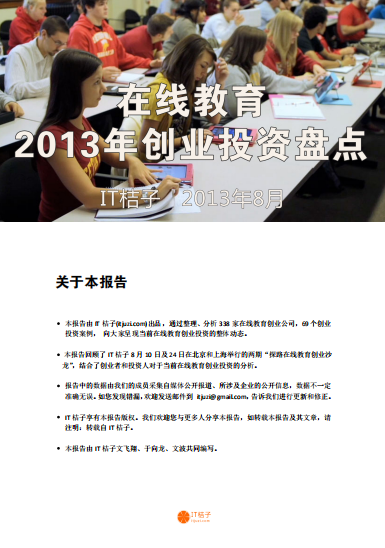 · 本报告回顾了 IT 桔子 8 月 10 日及 24 日在北京和上海举行的两期“探路在线教育创业沙