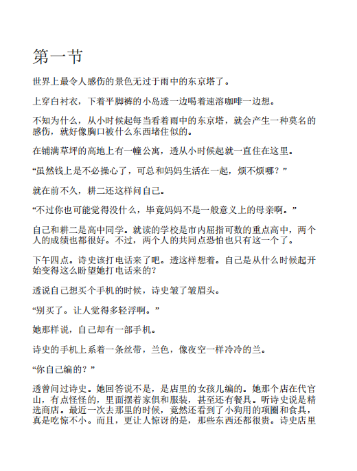 厌的是,在任课老师中就属那个经常检查出勤情况的老师的课最没意思。透打开音响,一边望着玻璃窗外雨中的房屋和东京塔,一边静静地