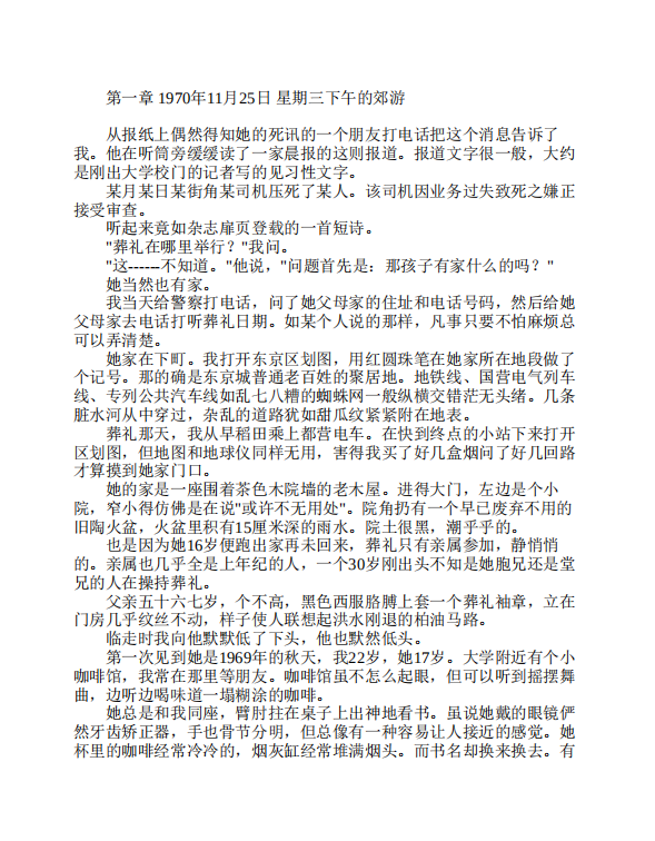 村上春树(1949- ),日本小说家。曾在早稻田大学文学部戏剧科就读。1979年,他的第一部小说《听风之歌》问世后,即被搬上了银幕。随后,他的优秀作品《1973年的弹子球》、《寻羊冒险记》、《挪威的森林》等相继发表。他的创作不受传统拘束,构思新奇,行文潇洒自在,而又不流于庸俗浅薄。尤其是在刻画人的孤独无奈方面更有特色,他没有把这种情绪写成负的东西,而是通过内心的心智性操作使之升华为一种优雅的格调,一种乐在其中的境界,以此来为读者,尤其是生活在城市里的人们提供了一种生活模式或生命的体验。