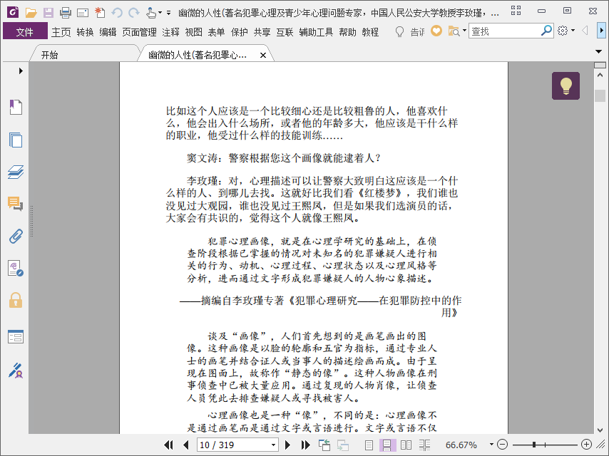 幽微的人性是由李玫瑾所著,全书取材于李玫瑾在电视谈话节目中的访谈内容,在书中介绍了犯罪心理学画像的理论,也借此阐述了心理学在预防和惩治罪恶的重要性。