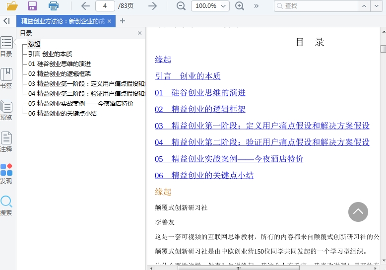 代应该采用什么样的创业方式,书中会有一个逻辑的推演。再次是本书的核心部分,即系统介绍精益创业