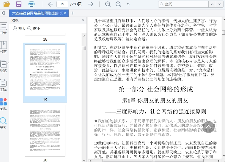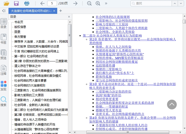 本书讲述了社会网络是如何形成的以及对人类现实行为的影响,如对人类的情绪、亲密关系、健康、经济的运行和政治的影响等,并特别指出,三度影响力(即朋友的朋友的朋友也能影响到你)是社会化网络的强连接原则,决定着社会化网络的功能。