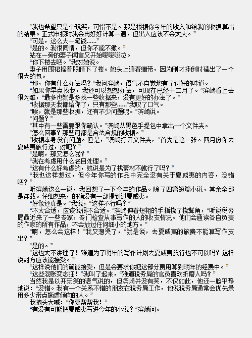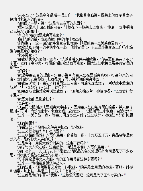 这本书类似东野圭吾的笑小说系列,尤其是此书揭秘出版社、写手作家等一些不太好的方面,大叔用黑色幽默的写法写出来,出版商勇敢的出版发行,这有点像自我批评的感觉,好吧,能自我批评的,一般都是肚子里有货不怕被批评的。既然作者、出版社都如此大方了,那么即便书中有讽刺读者的,我们也一笑置之,不过一本书而已,我们被批评得起。这本书还是走的短篇小说合集的路子,毕竟用一个完整的故事,串联出不同角色、地位人的观点,难度太大。加上合集也算喜闻乐见的一种方式,加上书中本身通过夸张的说法进行讽刺,看完后能让人会心一笑,实属阅读体验很佳的作品。书中某些作者既可笑又可怜又可恨。作者本心是好的,想到的推理桥段也比较精巧,但推理的点很简单,无法设置太多情节,所以只能写成短篇小说。然而已经签订的写作协议,加上为了减税而必须在书中加入不相关的情节,如何解决?唯有灌水。水文很讨厌,在面对完全没有必要的番外,尤其是到了精彩环节急需知道后续发展时跳出来的番外,恨不能杀之而后快。番外已经算很用心的水文了,如果作者为了拉长篇幅,不停的往情节中注水,明明已经昭然若揭的真相,偏偏还要加入回忆、联想等各种不必要的桥段,真真想砍人。想想看海盗王一个打架的情节,可以画三四集,对于一周才一集的追番人,心情可想而知。水文,先伤害读者,然后伤害作者。读者看烦了,作者失去读者,最后两败俱伤。尤其出版社竟然有以文章长度来判断作者水平的趋势,真不明白这究竟是谁想出来的评判标准。因此我现在对于尚在世的作者,除非我已经看过并认可了他的文字,否则宁可不打开他的书浪费时间,这究竟是作者的悲哀,还是读者的悲哀。书中提到了自动书评机、自动桥段设计机、自动书摘机,挺敢想象的。读书对读书人究竟意味着什么,真的摒弃所有功利心后还能剩下的读书人,究竟有多少,又究竟会读什么书,这很值得思考。自称也是每年一百本书的爱书人,经常迷惑于自己看到的书究竟分布如何,通过分析,更多是小说。好在最近几年对小说也有所取舍,偏向于看名著和过世作者的书,所以还算阅读体验愉快且齿颊留香。而如果只是为了读书而读书,其实很难读下去。逼迫自己读的理想国、中国哲学简史、艺术史,真的是囫囵吞枣,生吞活剥,看完后整个人如释重负。短时间内感觉没有太大的变化,但在不自察的情况下,偶尔也能跳出小天地,发现平凡生活中的朴素规律及小美好,想想也挺好的。读书应该是一个快乐的行为,虽然也需要强迫自己去盯着一个专业进行主题阅读,有目标有考核有侧重的阅读,但更多希望能多读书,读杂书。广泛中才能发现和拓宽自己的喜好点,而你的兴趣点越多,书籍给予你的回馈和支撑就越多,才能更纯粹的在读书中获取快乐。最后用书中一个精巧的推理结束此文。解密杀人事件,成名作家迟迟无法交稿,出版社工作人员推理出作家已经死亡,此文为作家最后的遗作,其中最重要的杀人动机并未写明。于是丈夫和工作人员在思考杀人动机的过程中,逐渐体会到文章中的杀人动机,最后成了现实中的解密杀人事件。虚虚实实,雾里看花,水中望月,书中的和现实的逐渐交错,最后杀人真的发生了。功力,好看。东野圭吾还真是很多文体、内容都在尝试,毕竟尝试的多,可以拓宽他涉猎的范围,发现不一样的东野圭吾。