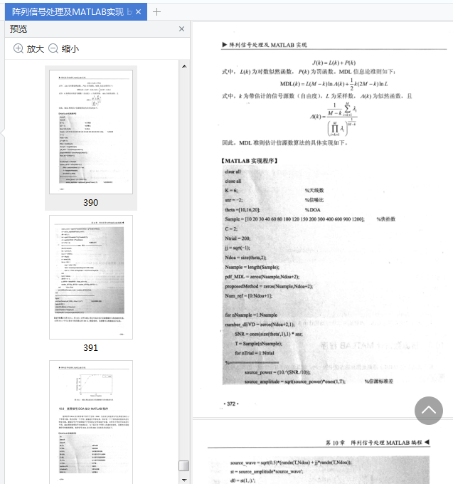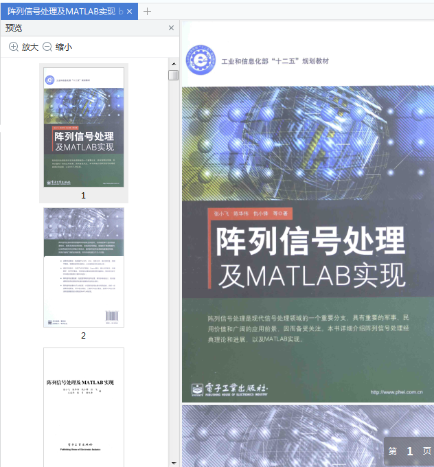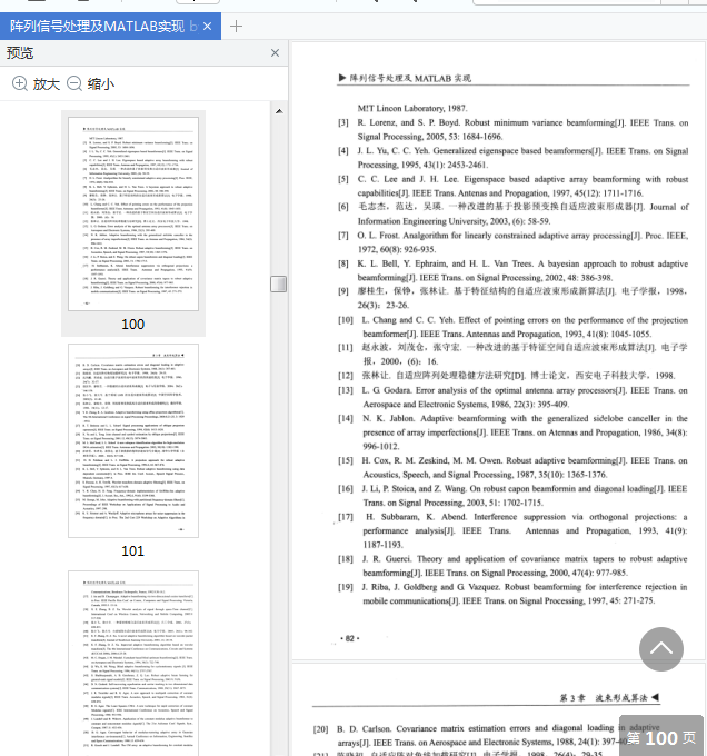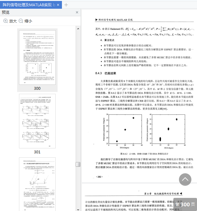 波柬形成算法:包括基于LCMV,GSC、投影分析、高阶累积量,周期平稳性、恒横的波束形成算法,以及鲁棒波束形成算法等;波达方向估计:介绍了MUSIC算法、Capon算法、最大似然算法、传播算子、ESPRIT算法、子空间拟合算法和四阶累积量算法,同时研究相干DOA估计算法和二维DOA估计;阵列信号处理发展:包括宽带阵列信号处理、阵列多参数估计、极化敏感阵列信号处理和声矢量传感器阵列信号处理等;阵列信号处理MATLAB实现:介绍阵列信号处理中常用函数,讲解一些波束形成算法、DOA估计算法、二维DOA估计算法、宽带DOA估计算法和信源数目估计算法的MATLAB实现.
