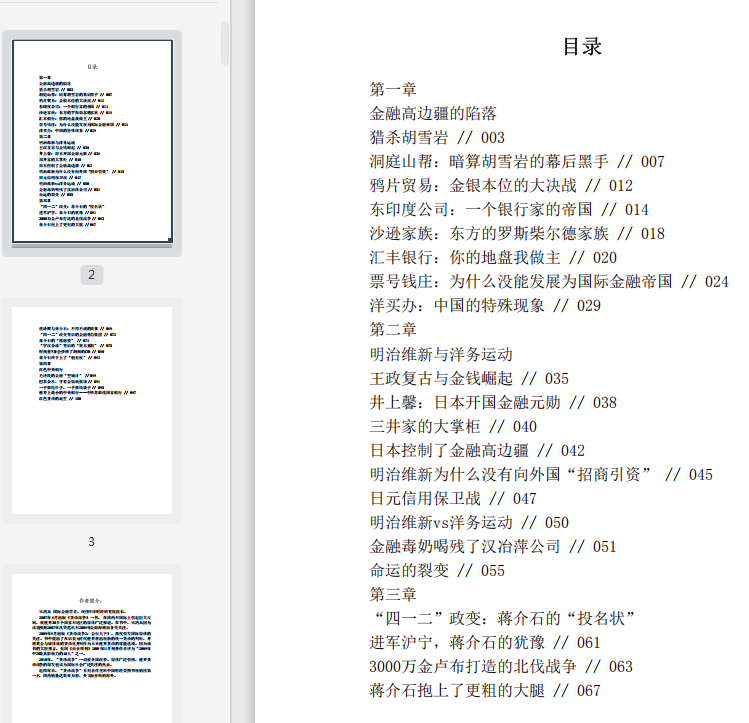 《货币战争3》以近现代中国为焦点,从货币的角度观察中国近代的沉沦与抗争,论述了近代中国货币怎样突破各国金融及战争的干涉,通过为人民服务,通过独立自主,一步步艰难建立自己的体系,创造奇迹的过程。并在其中提出且阐释了把金融作为国家第四维边疆的战略意义。