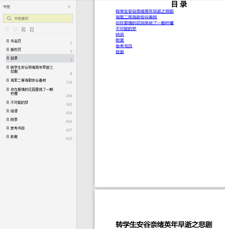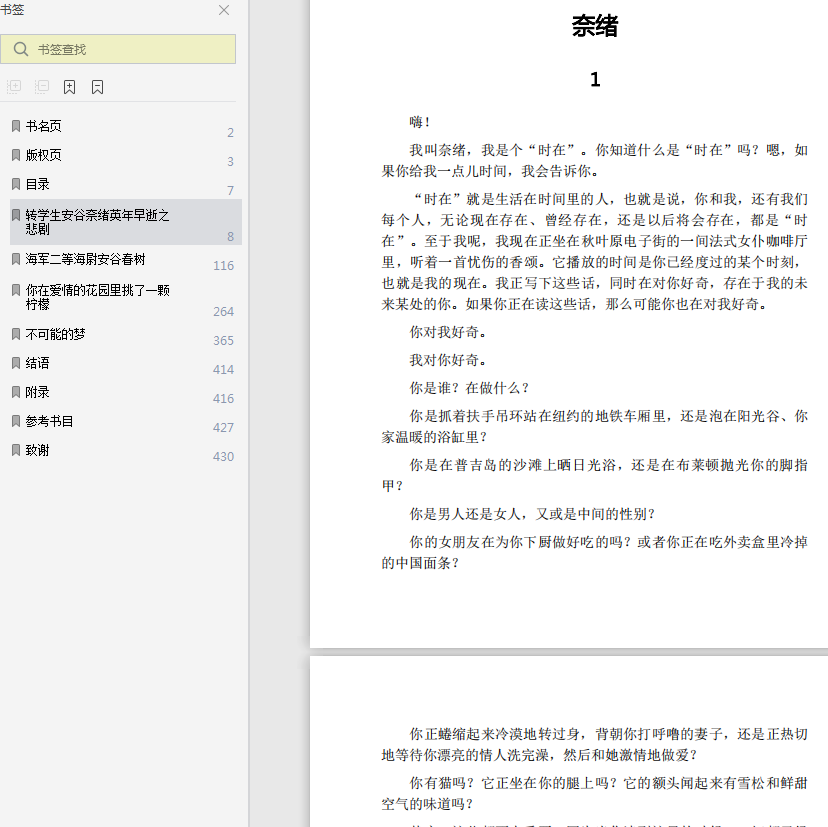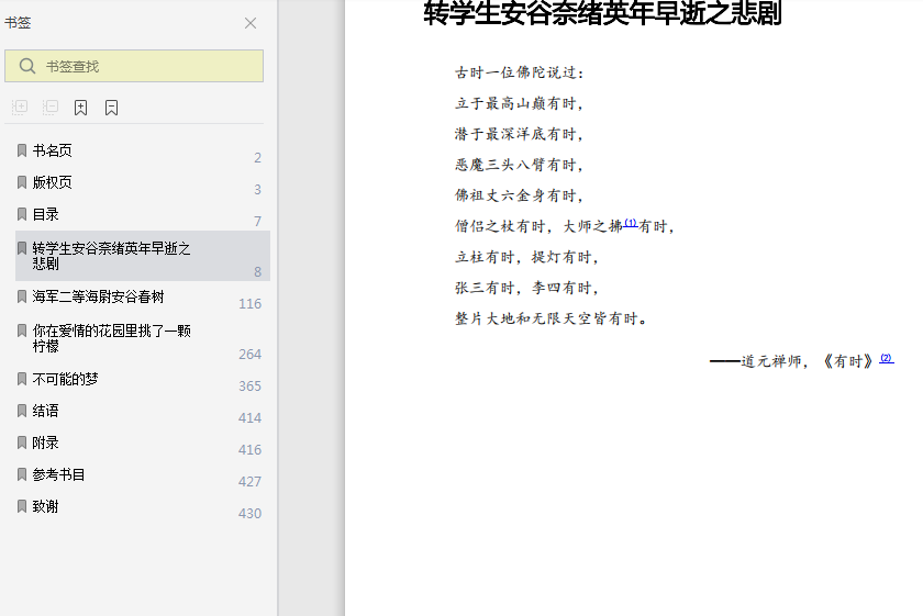“你真是个傻瓜,安谷奈绪子!一个懦夫,连一点点儿霸凌都不 能承受,他们不过是和你同样可悲的孩子!他们对你做的事和你舅公 忍受的相比,就是一颗花生。春树一号只比你年长几岁,但他勇敢、 成熟、聪慧。他在乎他的学业,并且勤奋学习。他懂哲学、政治和文 学,他能读英语书、法语书、德语书,还有日语书。他知道怎么吞枪 自杀,但是他不想那么做。你呢,安谷奈绪子,和他相比你太可怜 了。你懂什么?漫画。动漫。阳光谷。加州。柳生十兵卫酱和她的可 爱眼罩。你怎么能这么蠢,这么微不足道!你的舅公春树一号是个热 爱生命与和平的人,你是只悲哀的小虫,安谷奈绪子,如果你不立刻