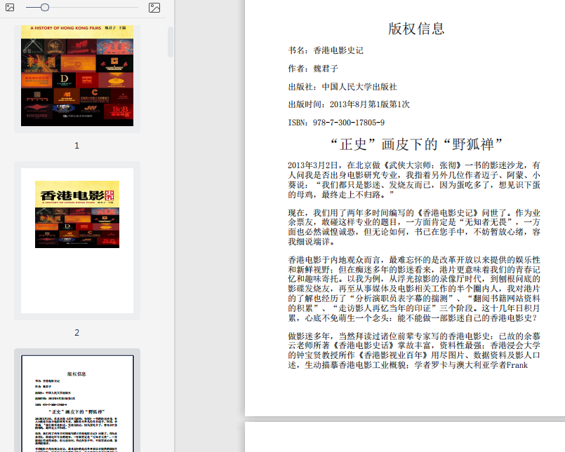 本书仿拟《史记》体例,以民间视角和观众身份重述了香港电影近百年历史,重点刻画香港电影人以及重要影片和电影事件,讲述影坛台前幕后的种种趣闻与秘闻,梳理香港电影与各种阶层和势力之间的负责关系,可读性强,史料丰富。